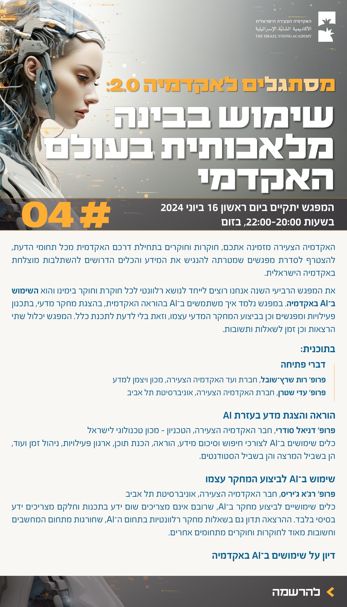 לצפייה במצגת של פרופ' דניאל סודרי - "כלים שימושים ב־AI לצורכי חיפוש וסיכום מידע, הוראה, הכנת תוכן, ארגון פעילויות, ניהול זמן ועוד", לחצו כאן