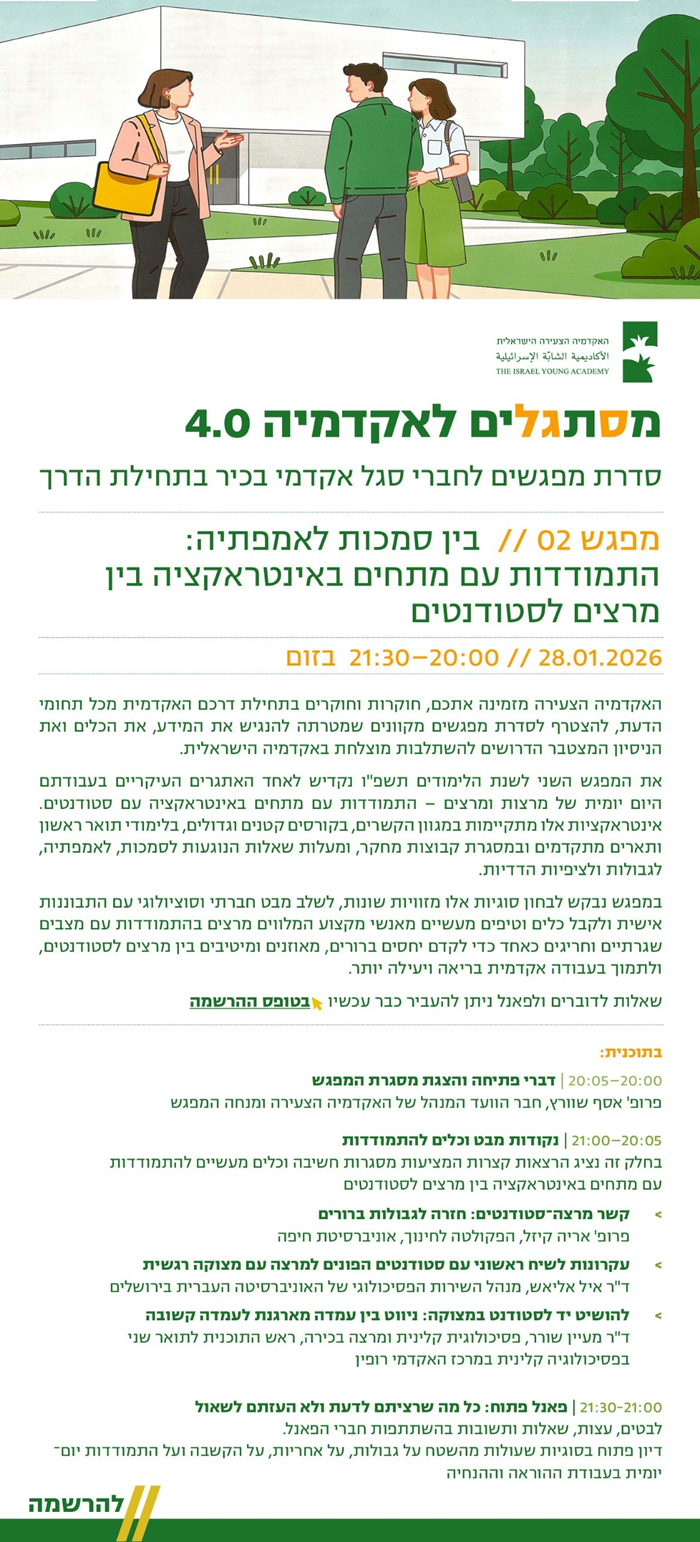 המפגש השני לשנת הלימודים תשפ"ו הוקדש לאחד האתגרים העיקריים בעבודתם היום-יומית של מרצות ומרצים – התמודדות עם מתחים באינטראקציה עם סטודנטים. אינטראקציות אלו מתקיימות במגוון הקשרים, בקורסים קטנים וגדולים, בלימודי תואר ראשון ותארים מתקדמים ובמסגרת קבוצות מחקר, ומעלות שאלות הנוגעות לסמכות, לאמפתיה, לגבולות ולציפיות הדדיות.