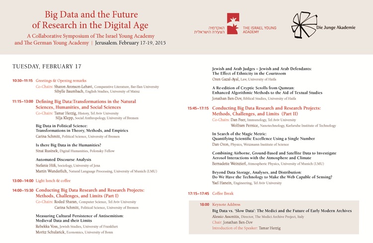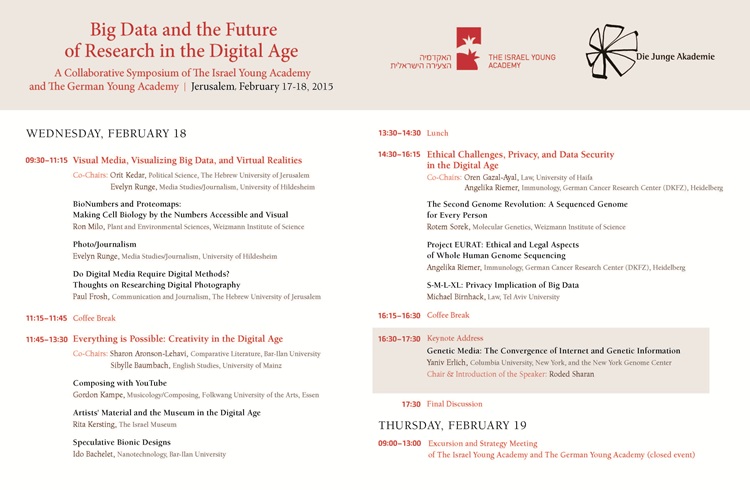 במסגרת פעילותה לחיזוק הקשר עם אקדמיות צעירות בעולם התקיים כינוס אינטרדיסציפלינרי משותף לאקדמיה הצעירה הישראלית ולאקדמיה הצעירה הגרמנית בנושא Big Data and the Future of Research in the Digital Age. מטרת הכינוס הייתה לקדם את הקשר בין המדענים משתי האקדמיות בשאיפה ליזום פעילות עתידית מחקרית ושיתופי פעולה. הכינוס התקיים בבית האקדמיה הלאומית בתאריכים 19-17 בפברואר 2015 ואירח קבוצה של כ–14 חוקרים גרמנים צעירים, רובם חברי האקדמיה הצעירה הגרמנית. כמו כן התארחו שני speakers keynote מאיטליה ומניו יורק. את הכינוס הובילו חברת האקדמיה הצעירה הישראלית ד“ר שרון אהרונסון–להבי וחברת האקדמיה הצעירה הגרמנית ד“ר סיביל באומבך. בכינוס עלו סוגיות הנוגעות למחקר בעידן הדיגיטלי וסוגיות הקשורות ב“ביג דאטה“, כגון האתגרים האתיים, נושא הפרטיות, שמירת מידע, העברת מידע, בינה מלאכותית, הדמיה ויצירתיות. הדיונים וההרצאות היו מתחומי דעת רבים ומגוונים - היסטוריה, מקרא, משפטים, מדע המדינה, מדעי המחשב, פיזיקה, גנטיקה, ביולוגיה, ננוטכנולוגיה, ננו–רפואה, צילום, תקשורת, תיאטרון, מוסיקה ועוד.