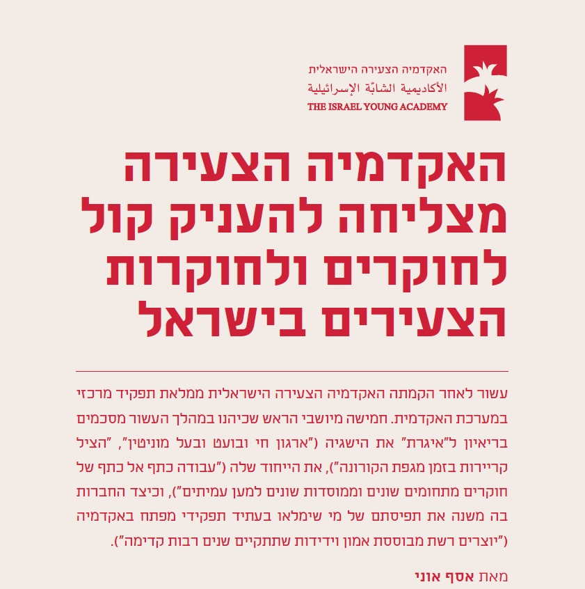 "האקדמיה הצעירה מצליחה להעניק קול לחוקרים ולחוקרות הצעירים בישראל" - מאמר המסכם עשור לפעילותה של האקדמיה הצעירה הישראלית. חמישה מיושבי הראש שכיהנו במהלך העשור מסכמים בריאיון ל"איגרת", ביטאון האקדמיה הלאומית הישראלית למדעים את הישגיה, את הייחוד שלה, וכיצד החברות בה משנה את תפיסתם של מי שימלאו בעתיד תפקידי מפתח באקדמיה. מאת: אסף אוני, התפרסם באיגרת גיליון 44, דצמבר 2022