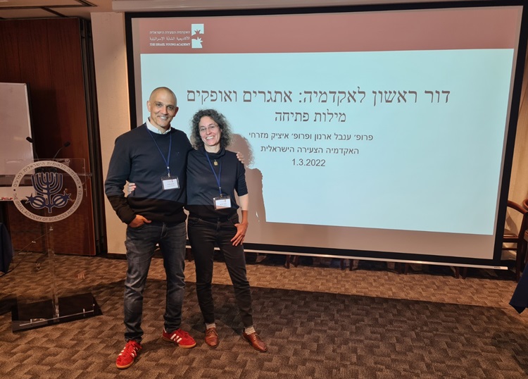 חברי האקדמיה הצעירה הישראלית פרופ' ענבל ארנון ופרופ' איציק מזרחי בכינוס בנושא דור ראשון לאקדמיה שקדם להוצאת הדוח, מרס 2022